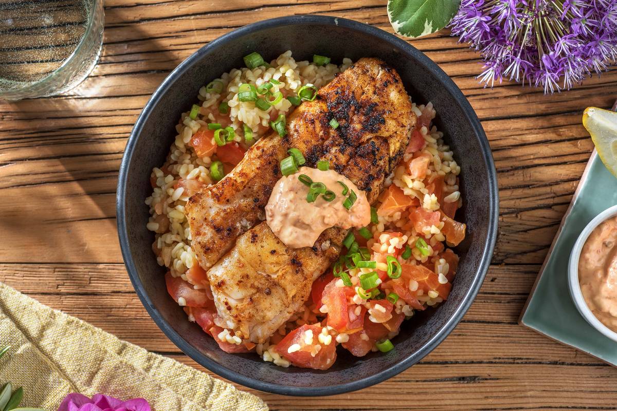 Marinierte Fischfilets von beiden Seiten je 2 – 3 Min. grillen, bis der Fisch innen nicht mehr glasig ist. Bulgur auf Tellern verteilen, gebratene Fischfilets dazu anrichten und zusammen mit Paprikadip genießen.