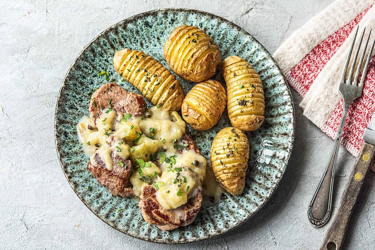 Hasselback-Kartoffeln und Rhabarber-Pfeffer-Soße auf Teller verteilen. Schweinemedaillons dazu anrichten, mit gehackter Petersilie bestreuen und genießen.